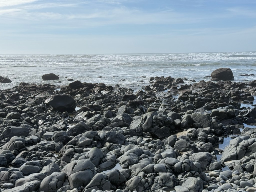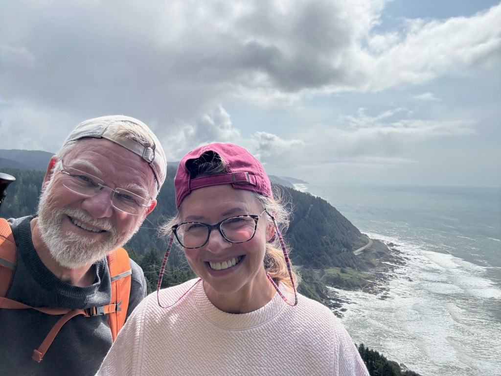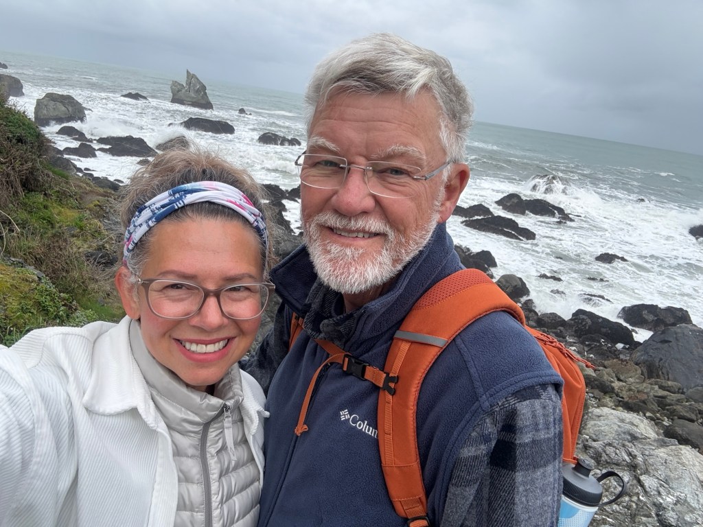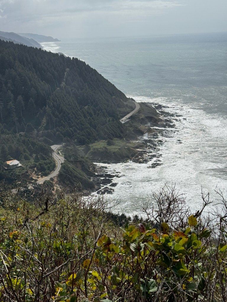 We are in Oregon and only 2 ½ hours from Drew, Shelby, and Evelynn. Do you guys feel a shift in the force? Ha! We are staying at an RV Park outside of Yachats called Sea Perch which is midway between Florence and Newport on the Oregon Coast. I found this RV park a couple of years ago just looking at Google maps and this park has been on my radar ever since. It is a small park, and our site is no more than 50 yards from the water. I would say 50 yards from the beach, but “beach” does not really describe the situation here. No sand, just lots of large black rocks which makes walking out of the RV and directly onto the beach a bit difficult. We would still stumble over the rocks, but we’ve been under gale warnings most of the time we have been here. Yes, more rain and wind! We had a few days’ break and got in a few more hikes. Finally, Loki has been able to hike with us😊 Thank you Oregon!